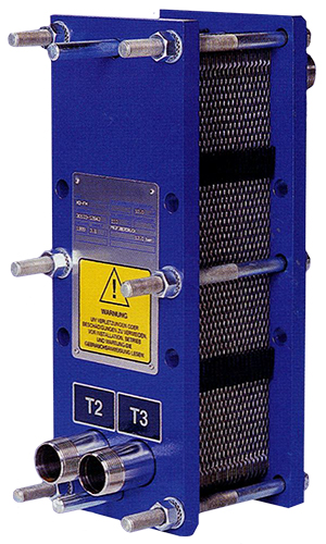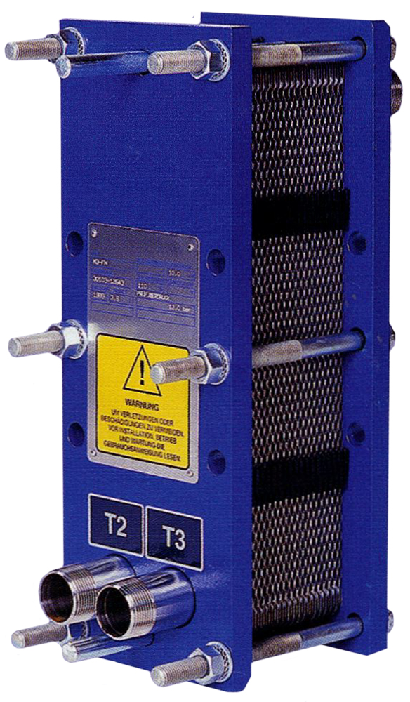 The plate pack is assembled between a fixed frame plate and a movable pressure plate and compressed by tightening bolts. The plates are fitted with a gasket which seals the interplate channel and directs the fluids into alternate channels. The number of plates is determined by the flow rate, physical properties of the fluids, pressure drop and temperature program. The plate corrugations promote fluid turbulence and support the plates against differential pressure.